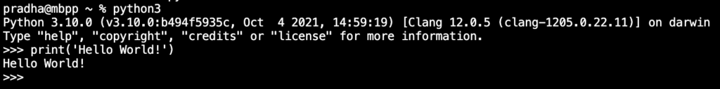 python3Jika Python terinstal dengan benar, Anda akan melihat prompt >>> yang menandakan Python siap digunakan. Disini anda dapat menulisakan langsung kode-kode python.